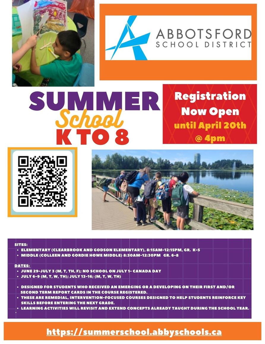 Registration is now open for the Abbotsford School District Summer School (K–8) and will remain open until April 20 at 4:00 pm. These programs are designed to support students who received an Emerging or Developing on their report card and focus on reinforcing key literacy and numeracy skills before the next school year.
